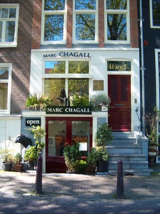 The Marc Chagall House is a stone's throw from the RIJKS Museum with the small Marc Chagall houseboat opposite. At the end of the last century, the base of the House was converted into a graphics gallery. In thirty drawers measuring 100cm by 70cm, hundreds of Chagall's lithographs, etchings and woodcuts are well protected in Museum passepartout and sealed with transparent plastic within easy reach. You find these works on our webpage with the official catalogue-number.